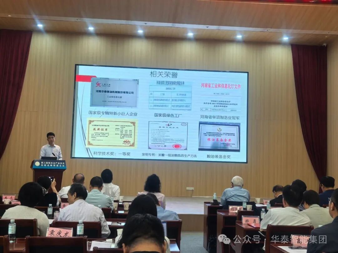 河南华泰智能装备集团是集研发、制造、销售于一体的粮油机械装备企业,产品覆盖油脂工程、蛋白工程、饲料、淀粉工程等多个领域,业务遍及全球60余个国家与地区。集团始终以科技为核心,致力于推动粮油产业智能化、绿色化发展。作为国内粮油装备制造领域的创新标杆,长期致力于米糠油技术的研发与应用。会上,集团技术总监陈杉详细介绍了公司发展历程、在米糠油加工工艺、装备创新及科研成果转化方面的突破性进展,分享了集团通过技术攻关实现的节能增效与产品品质提升案例,发言赢得了现场专家与同仁的高度认可与掌声。